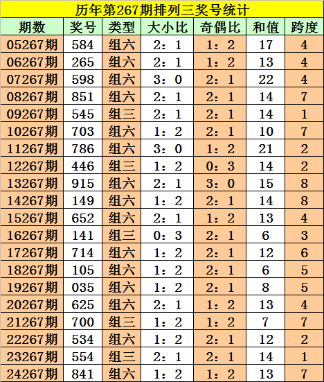 历年第267期排列三奖号中,开出次数最多三码为:0、4、5,本期注意号码:4。