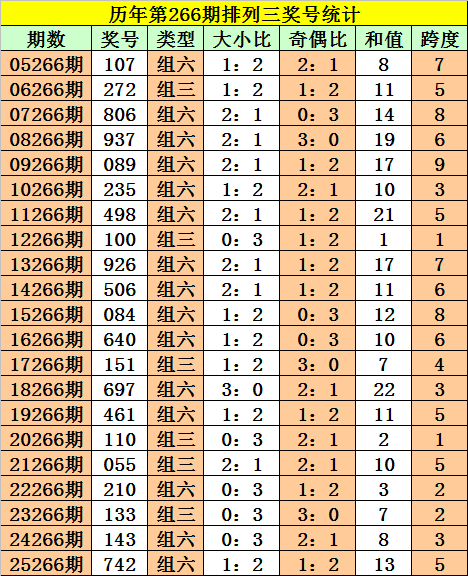 排列三第2025266期奖号:742,和值13,跨度5,大小比1:2,奇偶比1:2。