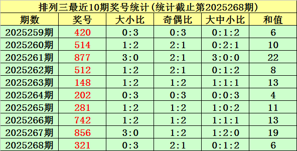 上期回顾:排列三第2025268期奖号为:321。奖号类型:组六,和值:6,奇偶比:2:1,跨度:2,大小比:0:3。