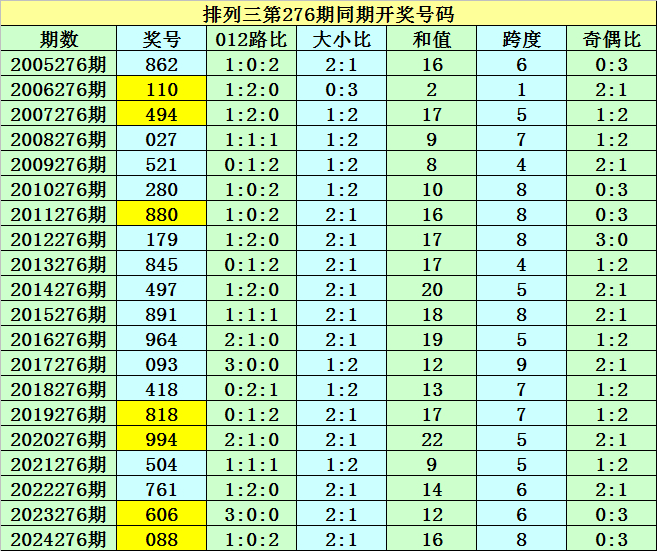 本期为排列三第2025276期开奖,开奖日期为:2025年10月17日,历史上排列三第276期已开出了20次奖号,历年同期开出号码分别为:862-110-494-027-521-280-880-179-845-497-891-964-093-418-818-994-504-761-606-088。