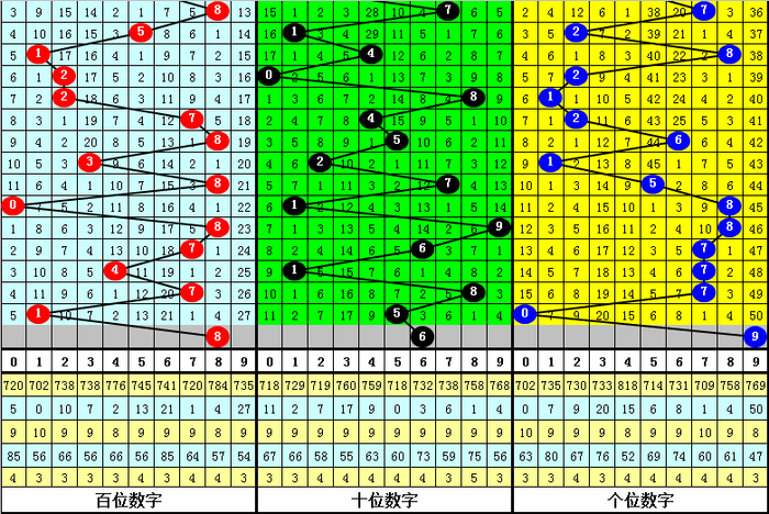 号码跨度:在第276期同期奖号中,跨度开出频次分别为:跨度5、8开出5期,跨度6、7开出3期,跨度4开出2期,跨度1、9开出1期,跨度0、2、3没有出现。去年同期开出8,本期看好跨度下降,一码跨度参考3。