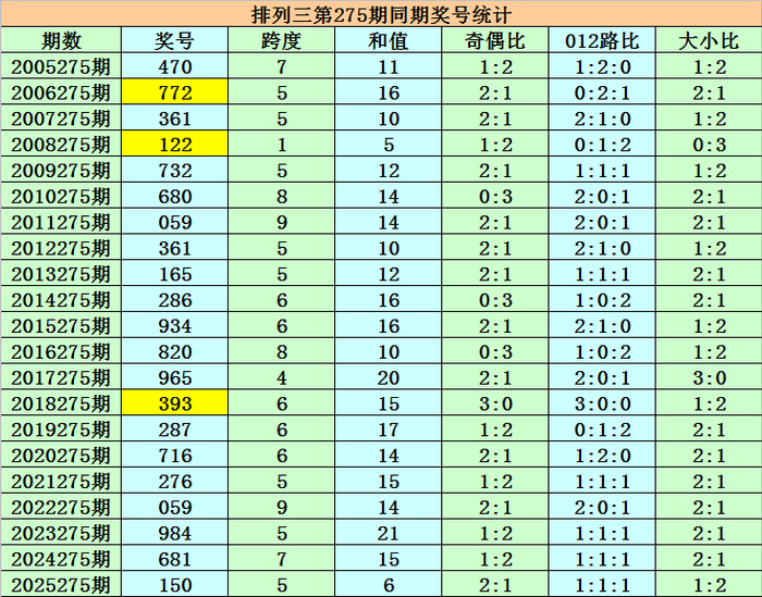 上期回顾:排列三第2025275期奖号为150,组选类型为组六,奖号大小比为1:2,012路比为1:1:1,奇偶比为2:1。