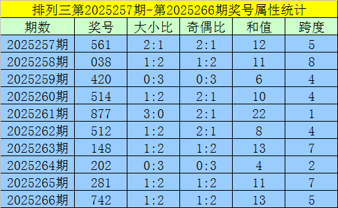 上期回顾:排列三第2025266期出现奖号742。开出组六,奇偶比1:2,012路比0:2:1,大小比1:2,和值13,跨度5。