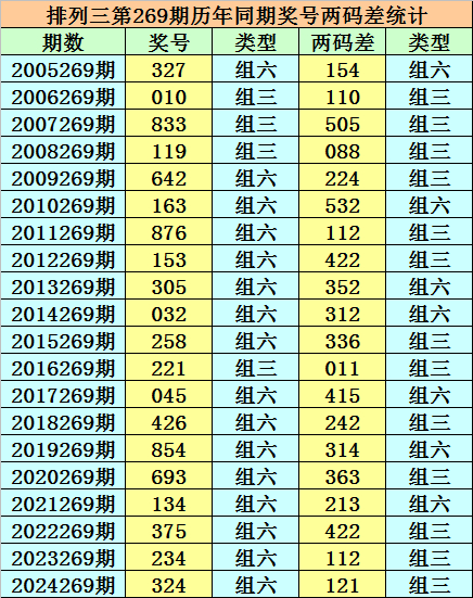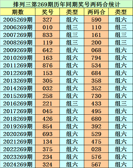 排列三从2004年开奖至今已开出7392期奖号了,其中第269期历史同期奖号出现20次,历年第269期分别开出号码:327、010、833、119、642、163、876、153、305、032、258、221、045、426、854、693、134、375、234、324。